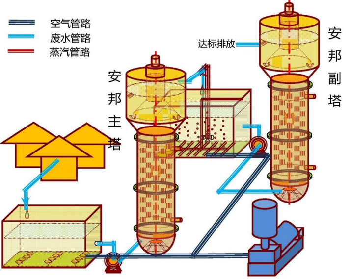 在安邦脫氮工藝中,主塔和副塔串聯。主塔采用“快生型”脫氮菌,可快速去除廢水中的硝酸鹽,實現高負荷,副塔采用“慢生型”脫氮菌,可確保出水達標排放。安邦系統后增加A/O生化系統作為達標保障。安邦生物脫氮技術依托安邦反應器和反硝化顆粒污泥。顆粒污泥濃度高達30~40 g-SS/L,小試容積負荷70kg-N/(m3·d),生產性容積負荷10kg-N/(m3·d),NO3--N去除率90%以上。